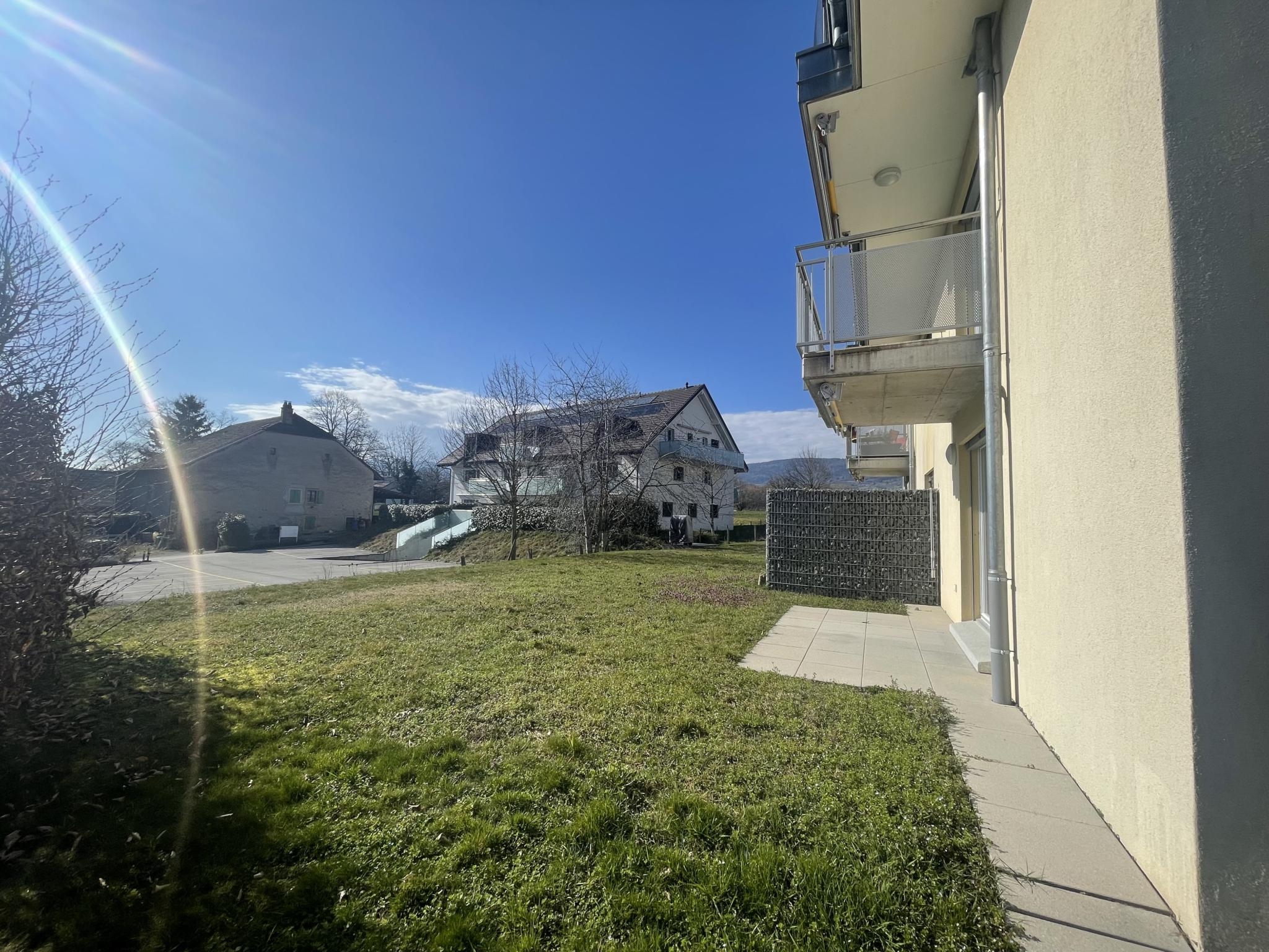 Spacieux appartement de 3.5 pièces d'environ 80 m2 au rez-de-chaussée avec une grande terrasse-jardin situé dans un immeuble récent de 6 logements, en bordure de zone agricole.