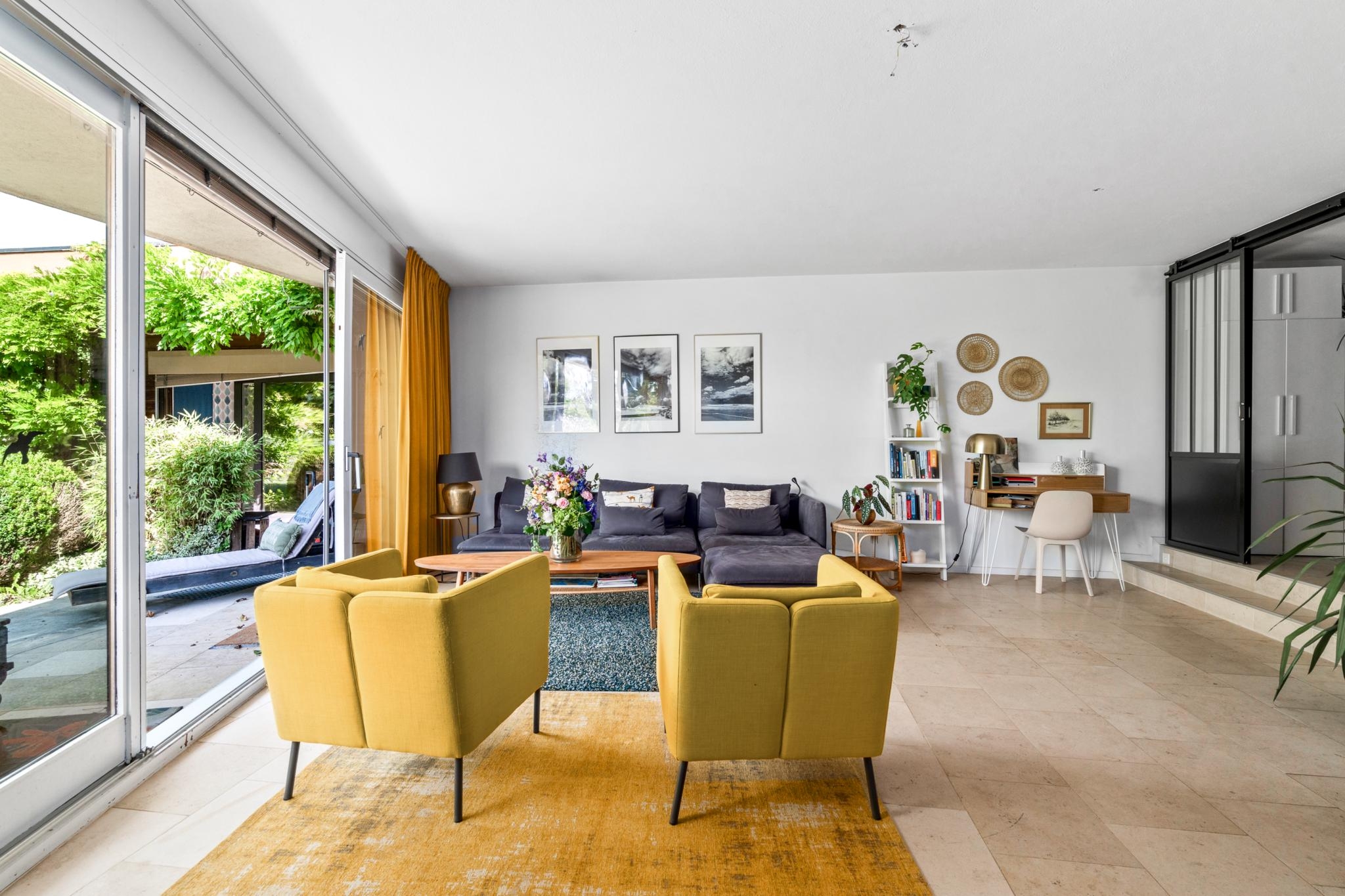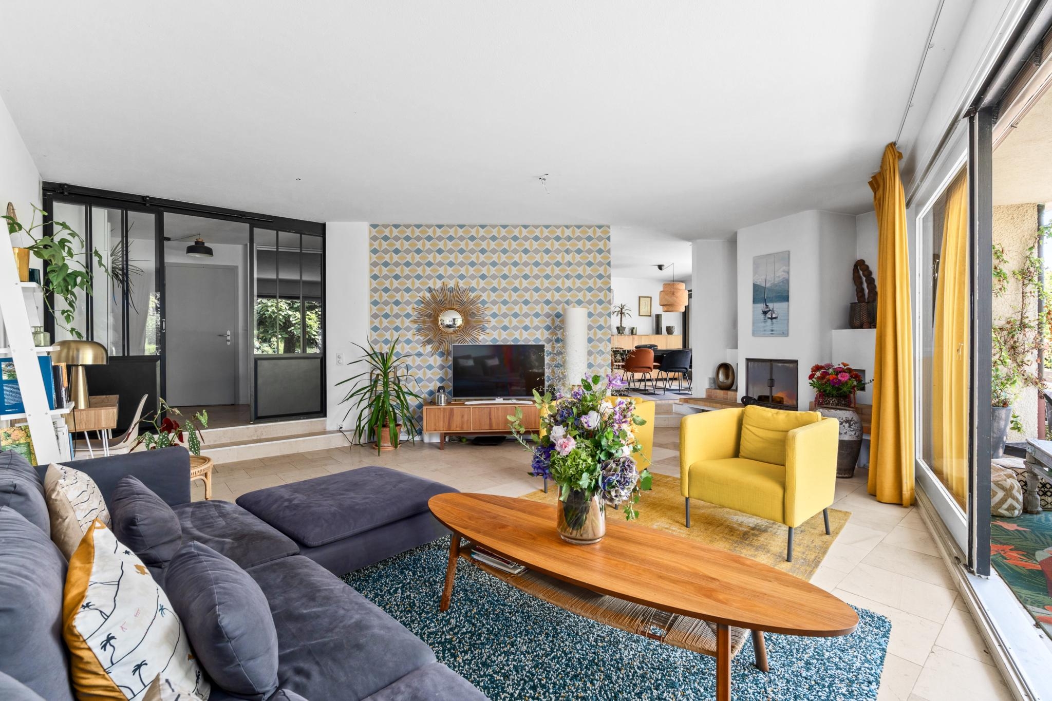 Il comprend une cuisine ouverte sur une salle à manger donnant accès à une belle terrasse, ainsi qu'un salon équipé d'une cheminée et menant également à une terrasse. L'appartement dispose de deux chambres, d'un bureau et de deux salles de bains. Un jardin magnifiquement arboré de 710 m², une grande terrasse orientée plein sud avec une vue dégagée complètent ce cadre de vie exceptionnel.